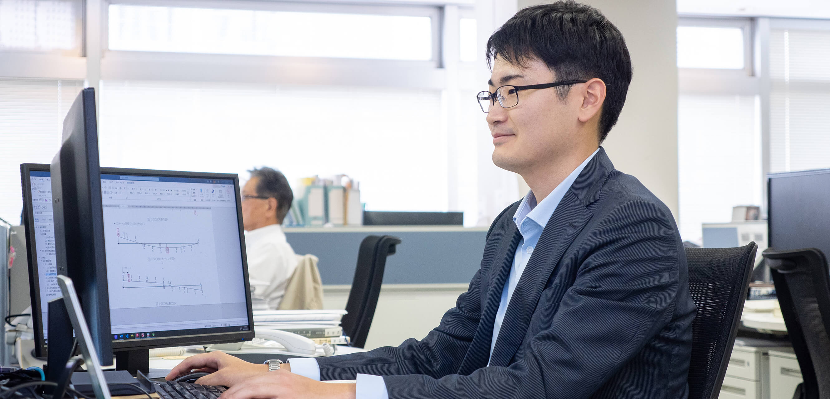 社会の基盤を支える公共構造物の設計に関心を持ち、その夢を叶えた森山。その仕事にかける思いを聞くと、フジミコンサルタントの事業がいかに大きな価値を生み出しているのかがよくわかる。